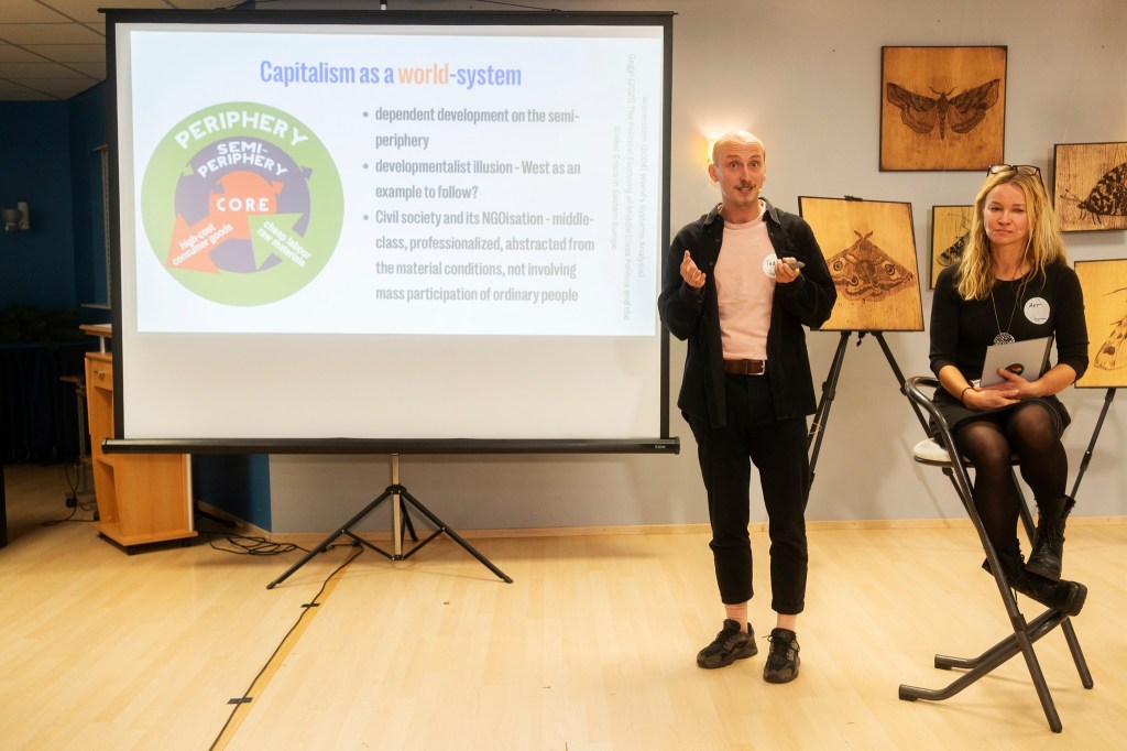 Konverentsireede algas tummise hommikupudru ja ettekandega tasaarengu kui liikumise väljakutsetest Ida-Euroopa kontekstis. Eestis üleminekuaega uurinud antropoloog Aet Annist ja Tšehhi tasaarengu organisatsiooni Na Zemi eestvedaja Tadeaš Ždarsky analüüsisid postsotsialistlike ühiskondade tõrget ühistumise, kapitalismikriitika ja vasakpoolse poliitika vastu.