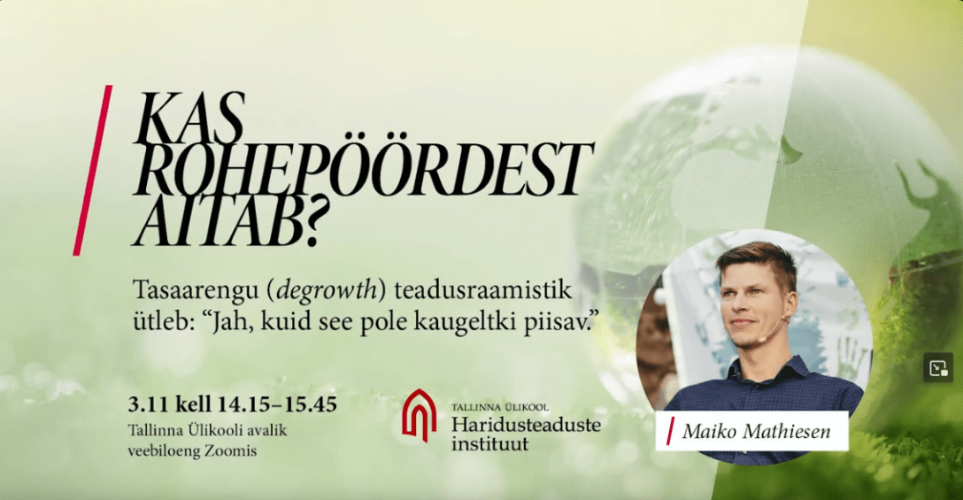 Elame kiirelt muutuvas maailmas, kus üks kriis ajab taga teist ning nende põhjuseid otsides peame aina enam vaatama peeglisse. Oma roll on siin kanda ka Eestil ja on aeg, et arutelu jätkusuutliku eluviisi, tasaarengu ja alternatiivsete majandusmudelite üle muutuks igapäevaseks normaalsuseks. MTÜ Tasaarengu Eesti ja Research & Degrowth mõttekoja liige Maiko Mathiesen tutvustab TLÜ avalikus… Continue reading Teokoja asutajaliikme Maiko Mathieseni avalik veebiloeng tasaarengust