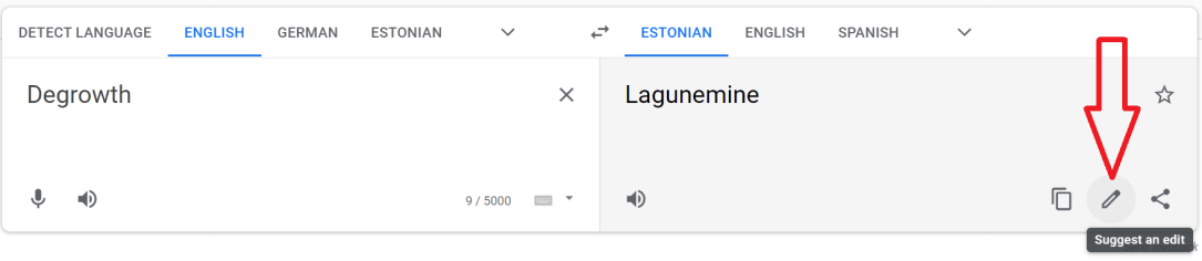 Üleskutse kliktivismiks - mine Google Translate tõlkelehele, tipi ingliskeelsesse kasti "Degrowth" (otselink) ja paku saadud tõlkele pliiatsi-ikooni (all paremal) abil uueks vasteks "Tasaareng" (algselt on olenevalt lausest kas "lagunemine" või "degradeerumine"). Õpetame masinale korrektset keelt! 🙂