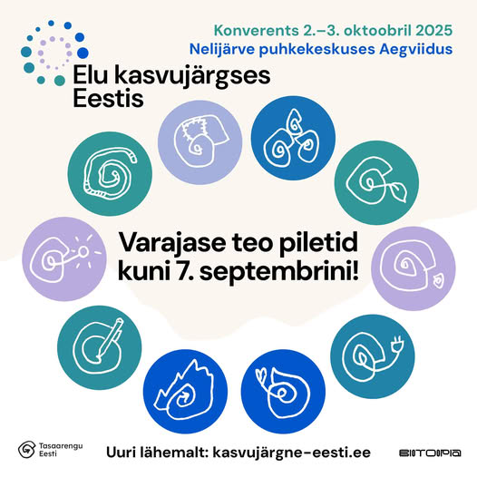 Soodsamad piletid konverentsile on saadaval kuni 7. septembrini. Varajane tigu jõuab õigeks ajaks kohale! Piletid on saadaval SIIN Kas Sina soovid kaasa rääkida, milline võiks olla heal elul põhinev tulevik Eestis? Võta osa konverentsist "Elu kasvujärgses Eestis" ja ütle sõna sekka. Konverents "Elu kasvujärgses Eestis" toimub 2.-3. oktoobril Nelijärvel ja on kokkusaamiskoht jätkusuutlikkusest ning inimeste… Continue reading Tähelepanu! Varajase teo piletid konverentsile on saadaval