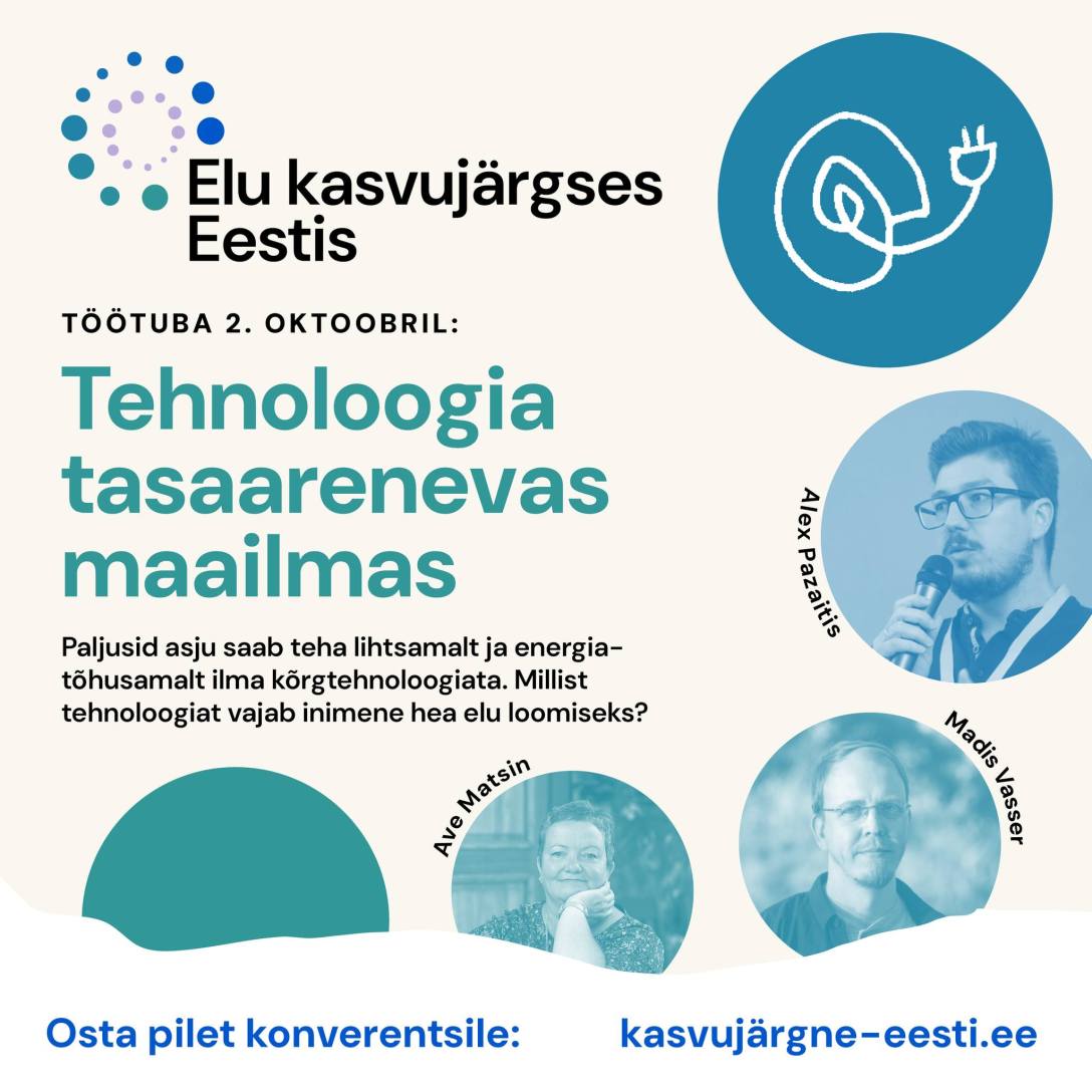 Lisaks konverentsi sessioonidele toimub 2. - 3. oktoobril Aegviidus, Nelijärve puhkekeskuses aset leidval konverentsil “Elu kasvujärgses Eestis” kahe päeva jooksul ka mitmeid töötubasid. Kolmas töötuba kannab nime "Tehnoloogia tasaarenevas maailmas". Selle töötoas küsime millist tehnoloogiat inimene vajab hea elu loomiseks. Oleme inimkonnana harjunud, et tehnoloogia meie ümber muudkui areneb ning ka lootused keskkonnakriisi lahendamiseks on… Continue reading Konverentsi töötuba tasaarengulisest tehnoloogiast